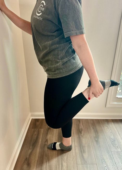 Instructions: Stand upright, holding onto a wall or chair for balance. Bend one knee and bring your heel toward your buttocks.
