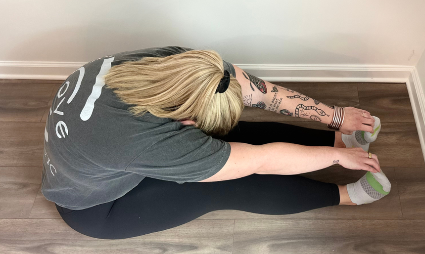 Instructions: Sit on the floor with both legs extended straight in front of you, feet flexed so toes point upward. Keep your back straight and hinge forward from your hips, reaching toward your feet. Only go as far as comfortable—avoid rounding your lower back. If you can reach your feet, gently pull them back for a deeper calf stretch.